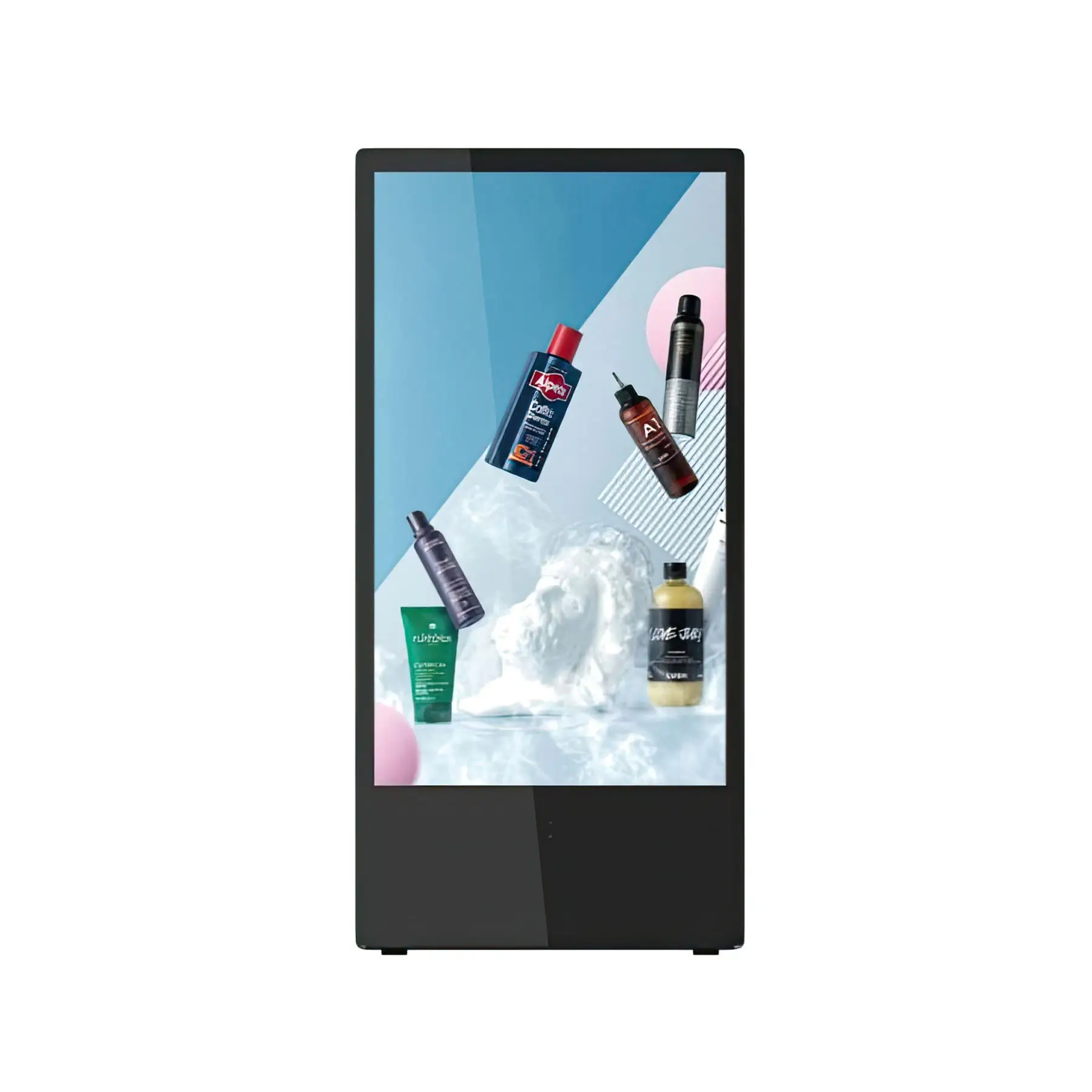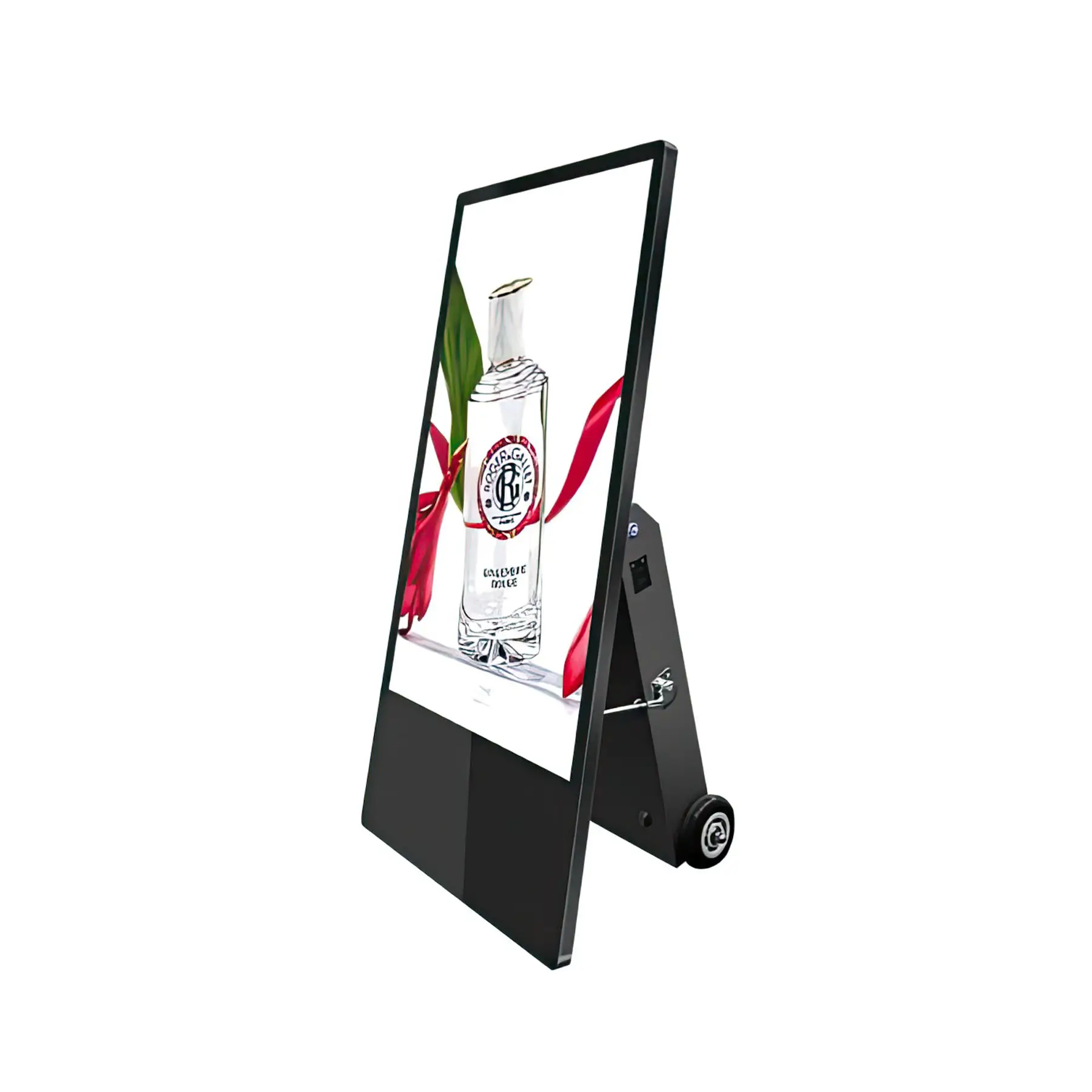 A battery-powered, foldable indoor digital kiosk with Android OS, cloud control, and 7-12 hours of cordless operation.